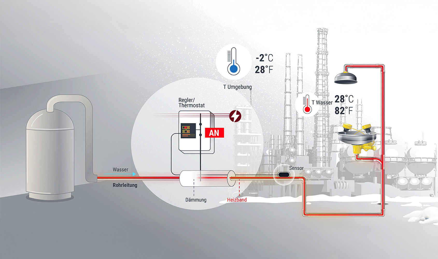 Schutz und Betriebssicherheit für Mess- und Regeltechnik. Instrumentenbeheizungen sorgen dafür, dass Sensoren, Ventile und Analyseeinheiten auch bei tiefen Temperaturen zuverlässig arbeiten – für präzise Messwerte und stabile Prozesse.